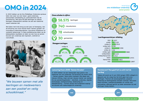 In 2024 hebben we bij vereniging Ons Middelbaar Onderwijs opnieuw laten zien waar we voor staan: goed onderwijs, persoonlijke ontwikkeling en verbondenheid met de samenleving. Met bijna 60.000 leerlingen en talloze bevlogen medewerkers werkten we aan een toekomst waarin iedereen telt.