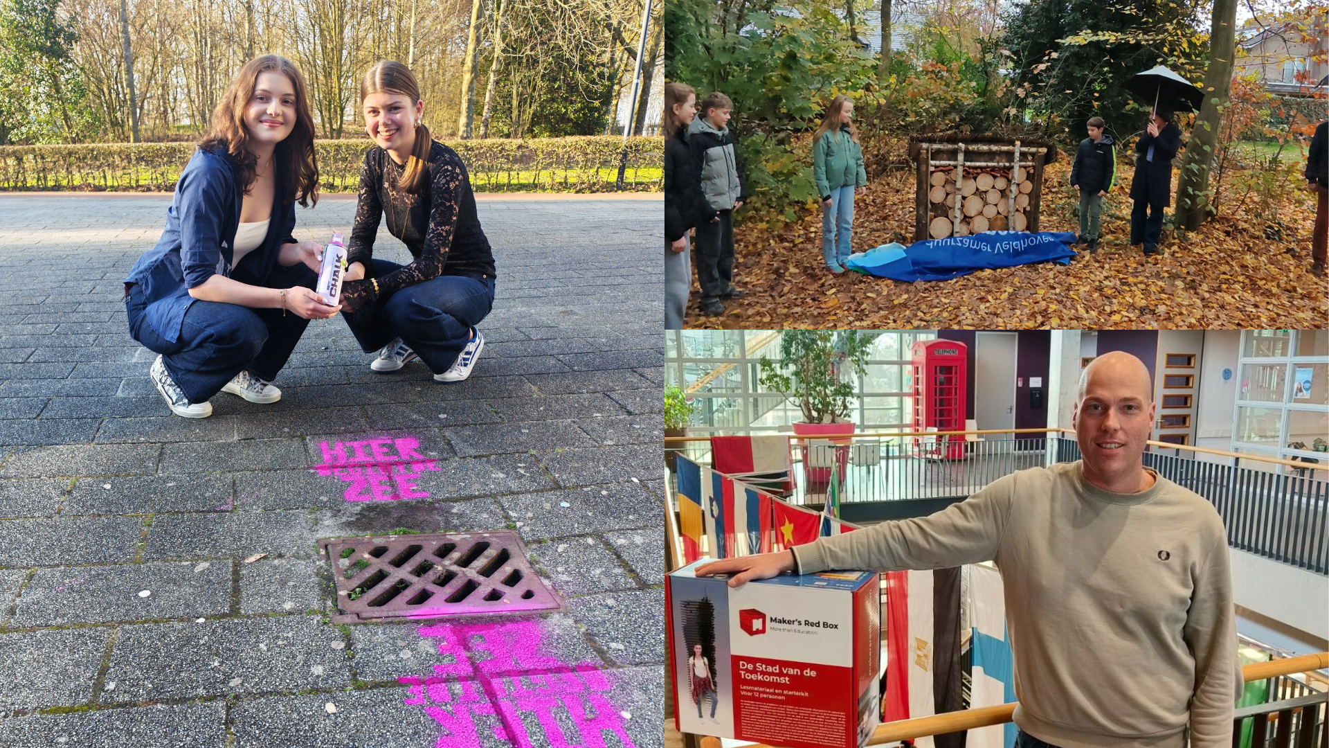 Een schoolplein vol vragen Een van de meest opvallende projecten ontstond uit een profielwerkstuk over plasticvervuiling. Twee leerlingen maakten een wereldbol van afval en bedachten een krachtige campagne: ’s Nachts markeerden ze alle putten op school (met toestemming van de gemeente) met biologisch afbreekbare verf en de tekst: Hier begint de zee! De volgende dag zorgde dat voor verwarring, gesprekken en nieuwsgierigheid door de hele school. Online gingen we viral met meer dan 27.000 weergaven. Dan zie je dat impact verder gaat dan een les. Het gaat leven.